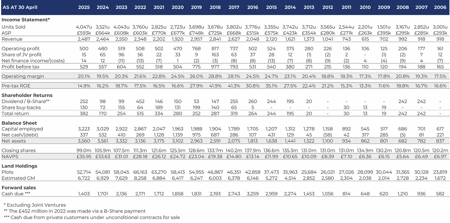 The bleak reality for Berkeley is that their capital base has swelled whilst their turnover has stayed the same. So whilst the obvious point to make is on margin compression (GM from mid-thirties to mid-twenties), it’s the WIP that’s grown 82% between 2015 and 2025 and the average capital employed swelling from £1.3b to £3.1b in a decade - whilst revenues have only grown 1.6% CAGR - that should really strike.