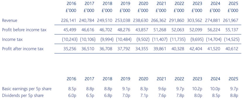 The best businesses are the ones that have some certainty to them. A coupon element. So predictable they’re bond-like. James Halstead is this. Despite revenue declines in the last two years the profits remain steady.